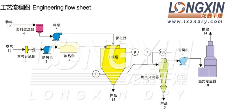 离心喷雾干燥机为热风循环、并流式、离心式雾化干燥机。干燥介质空气通过初、中效空气过滤器过滤,由加热器加热后,进入干燥器顶部空气分配器,热空气呈螺旋状均匀地进入干燥室。液体物料经过料液泵,输送到塔体顶部的高速离心雾化器,在离心力作用下喷雾成极细微的雾状液滴,与热空气并流接触,在极短的时间内可干燥为成品。成品连续被干燥塔底部和旋风分离器收集,尾气除尘后由引风机排空。