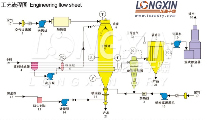 压力式喷雾干燥机是将料液压入位于塔体顶部的喷嘴雾化成微小雾滴,同塔顶热风平行而下完成干燥。该机具有收尘率高,无粘壁、节能高效等特点,特别适用于热敏性物料干燥。广泛应用于食品染料、中间体等行业。